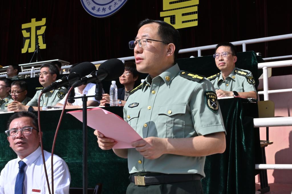 学生军训工作领导小组组长、校党委副书记郑大远在讲话中代表学校向圆满完成军训任务的同学们表示热烈祝贺,向空军工程大学承训教官和为军训工作辛勤付出的工作人员表示衷心感谢。他表示,军训是大学生涯的“第一课”,更是一堂淬炼意志、厚植情怀的“成长必修课”。同学们在战术训练中领悟了“令行禁止”的纪律意识,在战场医疗救护学习中懂得了“生命至上”的责任担当,在纪念中国人民抗日战争暨世界反法西斯战争胜利80周年主题活动中深化了“强国有我”的家国情怀。他希望全体新生要以“军人之姿”立心,锚定“为国担当”的航向;要以“军训之果”立行,锤炼“坚韧不拔”的品格;要以“自律之态”立身,筑牢“行稳致远”的根基,在西邮这片沃土上,以青春之名,赴时代之约,用智慧和汗水书写无愧于时代、无愧于人民的青春华章。
