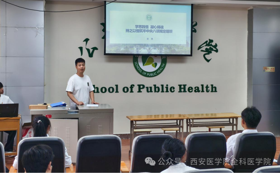 为增强学生党员作风建设意识,推动中央八项规定精神在青年群体中落地生根,全科医学院学生党支部于2025年6月10日组织开展“学思践悟 凝心铸魂 持之以恒筑牢中央八项规定堤坝”专题党课。此次党课由学生第一党支部书记安稳主讲,全体学生党员参与,通过历史溯源、案例解析与互动交流,让青年党员在思想洗礼中明确新时代作风建设的实践要求。