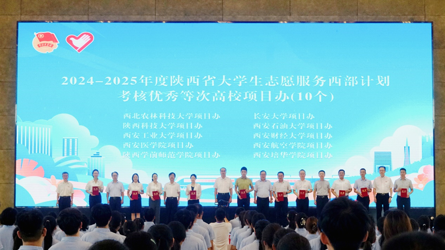 出征仪式现场,省项目办工作人员、集中派遣带队负责人及全体志愿者齐聚一堂,共同见证这一庄严时刻。在庄严的氛围中,全体西部计划志愿者高举右拳,郑重宣誓,集体发出“清澈的爱,只为中国”的青春誓言,表达了服务边疆、奉献青春的坚定决心。宣誓完毕后,全体人员齐声合唱《我和我的祖国》,激昂的歌声展现了志愿者们深厚的爱国情怀。随后,会上省项目办对2024-2025年度陕西省大学生志愿服务西部计划考核优秀等次项目办进行宣读及表彰。