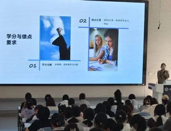 优良的学风可以提高学业素养,培养向上品格。乐学睿思团指导老师赵子睿给大家详细讲解了学校对学分与绩点的要求,以及所提供的良好学习环境——丰富的图书馆资源、数字赋能的一站式学生社区,为同学们的学习成长保驾护航。