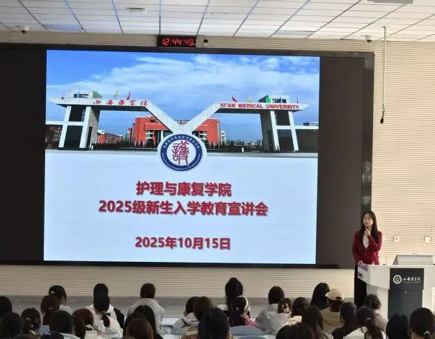 为使新生尽快适应大学环境,科学规划学业生涯,开启一段充实精彩的学习旅程,10月15日,护理与康复学院在教学楼成功举办了新生入学教育系列宣讲会,2025级各班班委、舍长参加。作为新生大学生涯第一课,学院高度重视,各专项负责老师及学生干部从党团教育、学风教育、奖助政策、心理健康教育、易班学习、国防教育、宿舍管理七个方面为大家呈现了一场别开生面的教育活动。本次宣讲会由辅导员李佳宁主持。