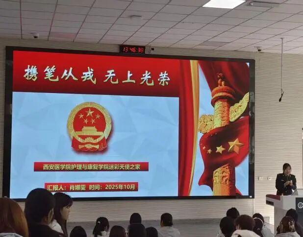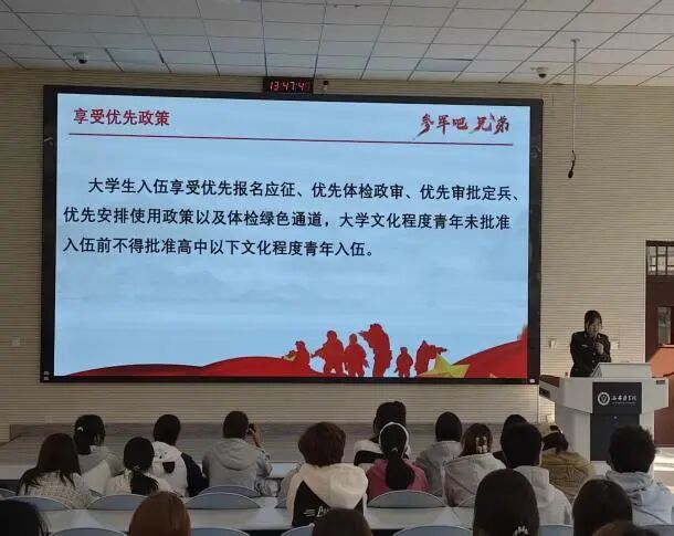 国防教育凝聚民族精神,筑牢安全屏障。护理与康复学院迷彩天使之家征兵工作站站长向参会学生讲解征兵的基本条件、参军流程、入伍优待及退役安置政策,鼓励同学们积极应征入伍,激发大家参军报国的积极性和自觉性,为国家的长治久安与繁荣发展贡献自己的力量。