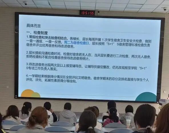 宿舍对同学们来说是日常起居的小家,是课后放松的港湾,更是四年同窗情谊滋生的温暖空间。学院学生会负责人向参会学生介绍了“5+1”S学生宿舍管理模式以及检查制度,鼓励同学们积极参与宿舍治理,齐心协力营造一个温暖、和谐、舒适的生活环境。