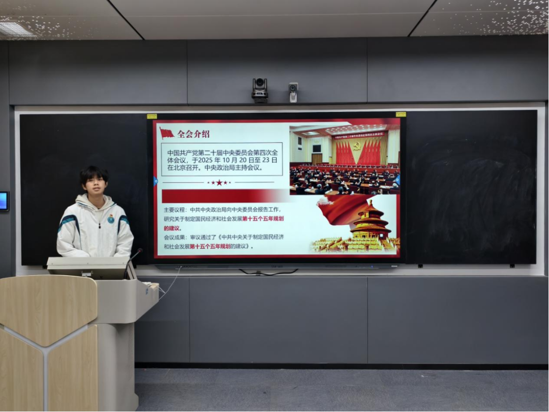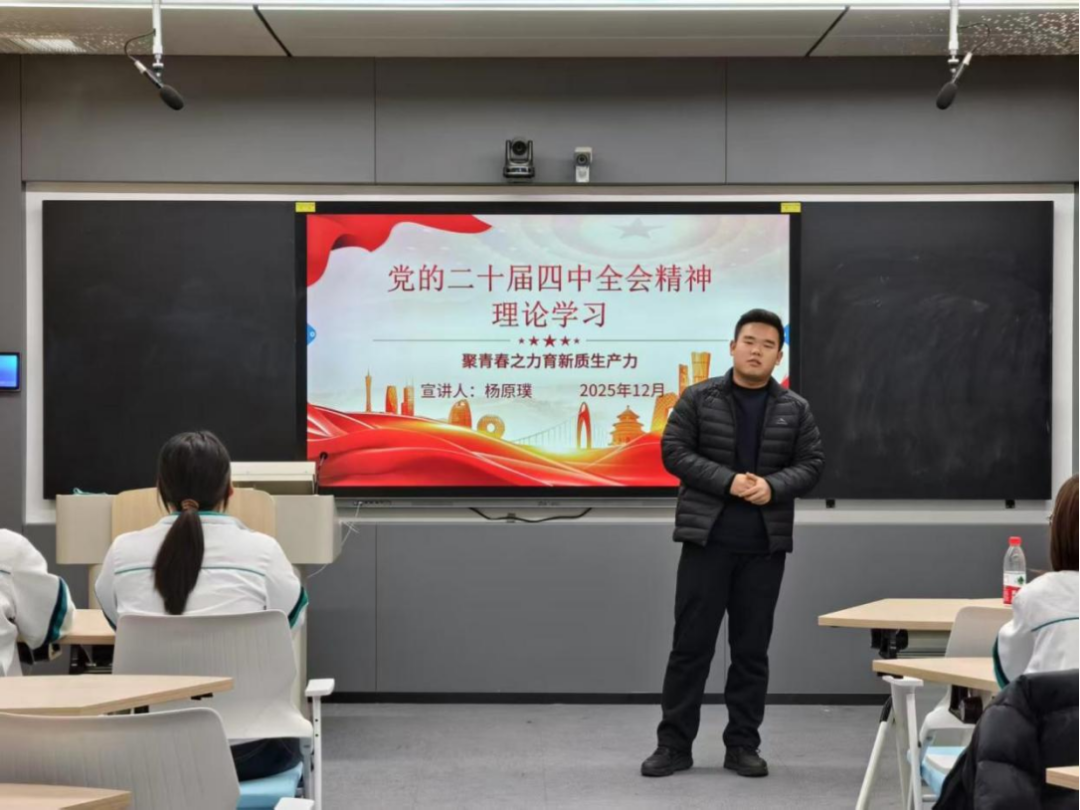 党员鲁力玮则围绕党的二十届四中全会的重大意义、“十五五”时期发展原则与主要目标,结合他自身担任团干部经历展开解读,鼓励大家将全会精神与专业学习紧密结合,从医药事业在国家发展大局中重要地位角度,主动思考如何将“十五五”规划中“推进健康中国建设”等要求,转化为自身的学习动力与实践方向。