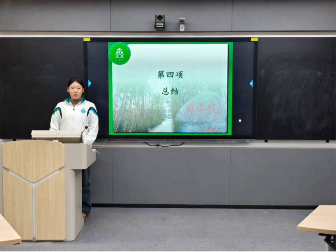 最后,药学院团总支副书记齐梓扬以“思学悟行”为题进行了活动总结。本次活动是学院深化党团一体化建设的重要实践,也是“大思政课”融入青年思想引领的具体举措,全体团干部要以此次宣讲为契机,持续深化理论修养,锤炼过硬本领,在实验室攻坚、专业学习和团务工作中践行全会精神,把青春活力转化为服务人民健康的实干力量。