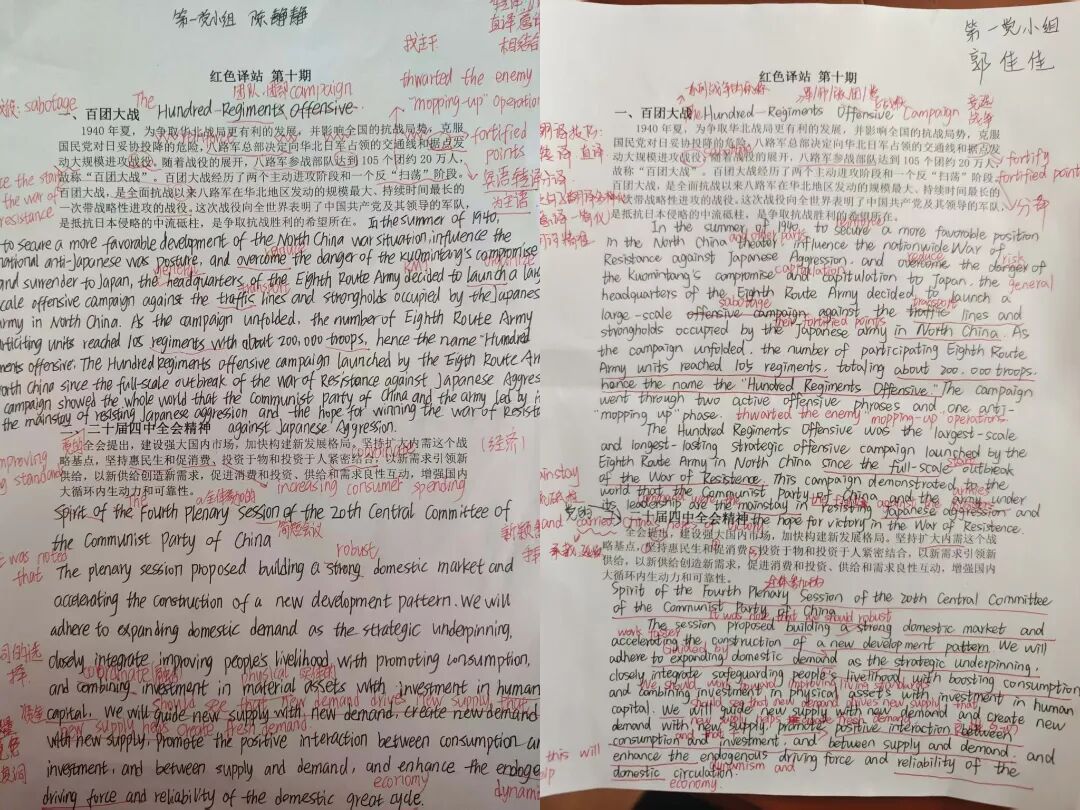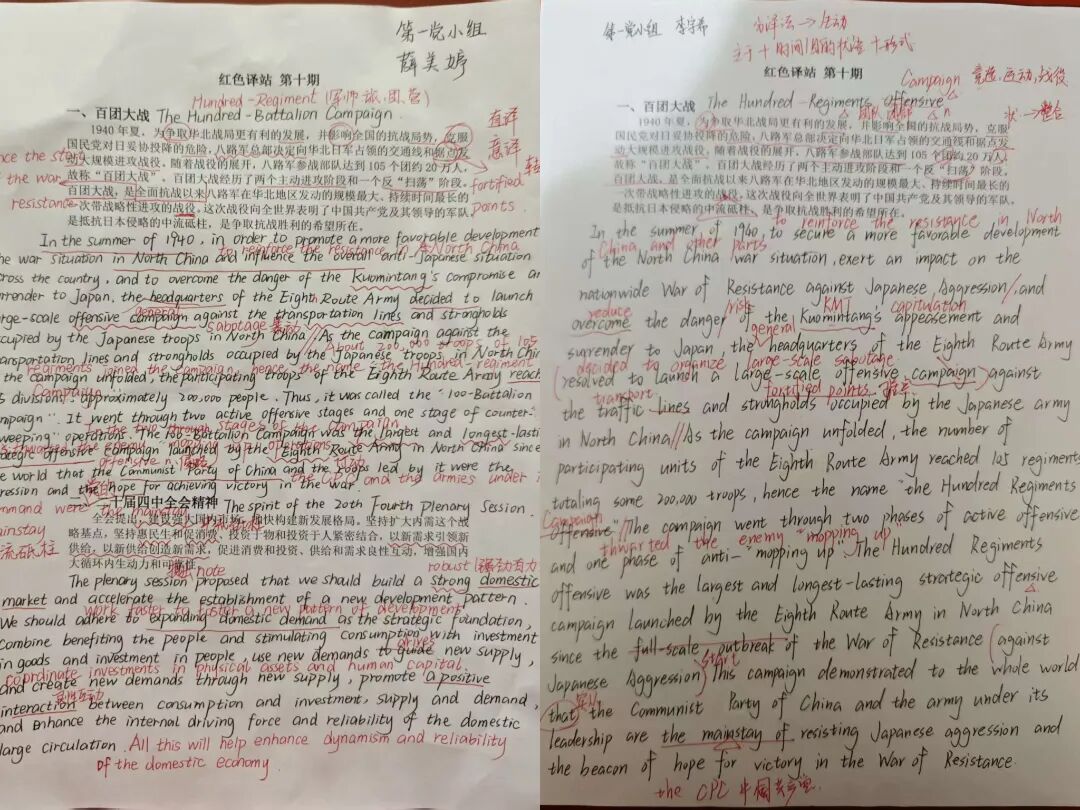 “红色译站”作为外国语学院党建工作的特色品牌,持续发挥着“以语言为载体,以红色文化为内核”的育人功能。本次活动以集体翻译和双语研讨相结合的方式,引导学生在翻译实践中深化对党史国史的理解,强化青年学生的责任意识与时代担当,助力青年学生讲好中国故事,传递中国声音。