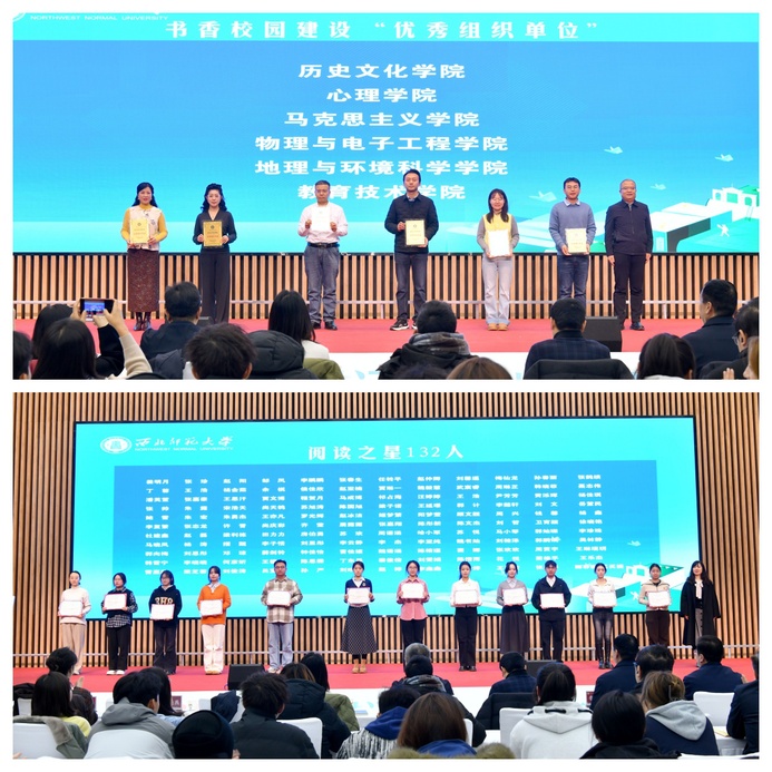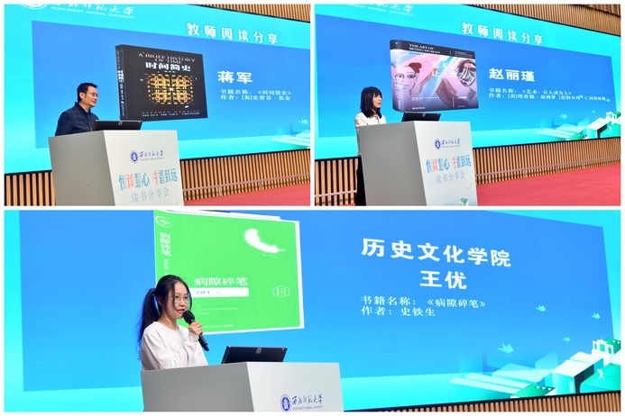 活动中,传媒学院赵丽瑾、物理与电子工程学院蒋军两位教师,以及历史文化学院王优等六位学生作为领读者,分享了《病隙碎笔》《艺术:让人成为人》《时间简史》等经典著作的阅读体会。现场为获得2025年度“阅读之星”“最美读书笔记”的学生及书香校园建设“优秀组织单位”颁奖。