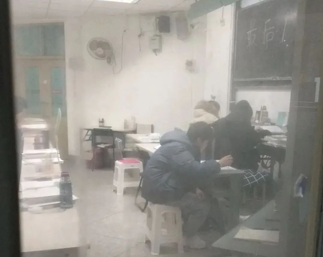 考研前最后一晚,汤成兰来看望李进,不忍打扰,在教室外偷偷拍下了这张照片。