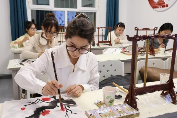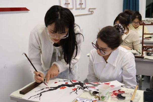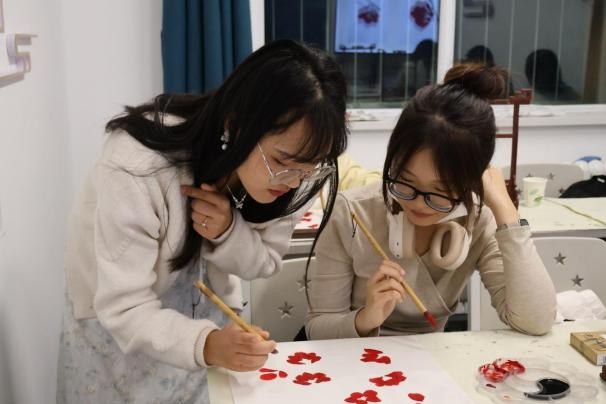 11月12日晚18:30,红湖校区3号宿舍楼开展国学馆“寓”韵丹青第三期国画体验活动。活动邀请国际文化交流学院2023级硕士韦祥平担任朋辈导师,讲解花鸟画基本技法,并示范运笔、用墨与着色,让同学们直观感受水墨交融的韵味。在实践环节,同学们铺纸研墨,细心勾勒枝叶,点染花瓣,绘出幅幅生动梅花,初步掌握了创作技巧,也深入体会到中国画“以形写神”的独特魅力。