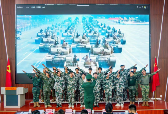 信息工程学院辅导员王博老师带领2025级新生代表与退役军人代表队共同唱响《当那一天来临》,他们神情坚毅、凝心聚力,满含着对家国的赤诚与担当。这首歌诞生于国防建设的时代背景下,承载着军人保家卫国的铁血担当与青年接力奋斗的赤诚信念。退役军人与新生代表以铿锵歌声和昂扬姿态,将“随时待命、奉献担当”的精神内核交融传递,迷彩青春与军装庄重交相辉映,让“保家卫国、薪火相传”的信念在歌声中熠熠生辉,尽显两代人对家国责任的共同坚守。