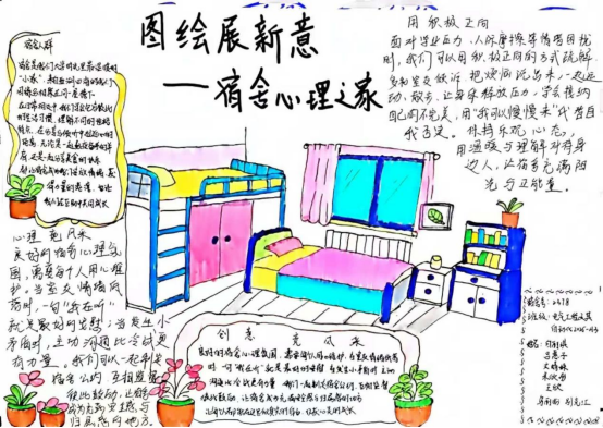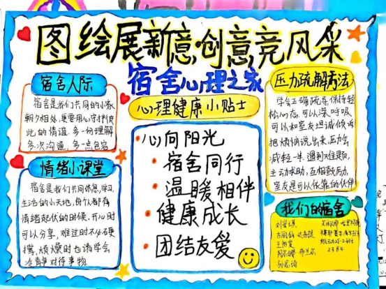 此次手抄报大赛,不仅为学生提供了展示创意与才华的平台,更成为一次心灵的洗礼。同学们在一笔一画中释放压力,在色彩线条中传递积极向上的心理能量,有效推动了心理健康理念在宿舍的传播,进一步筑牢了宿舍“心理之家”的温暖防线,为构建和谐文明的校园氛围奠定了坚实基础。