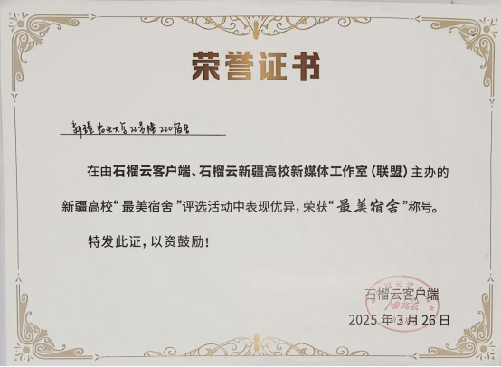 近日,由自治区石榴云新疆高校新媒体工作室(联盟)联合全疆15所高校共同发起的“最美宿舍”展选活动圆满落幕。经过激烈角逐,新疆农业大学学生公寓22号楼220农学院“肆合院”宿舍凭借其独特的文化氛围、整洁的环境设计以及团结友爱的寝室风貌,从全疆900余间参选宿舍中脱颖而出,荣获“最美宿舍”称号。此次活动累计吸引266万余人次线上围观,2万余名学子参与助力,收获29万余次“小心心”点赞,充分展现了新时代大学生的青春风采与校园文化活力。