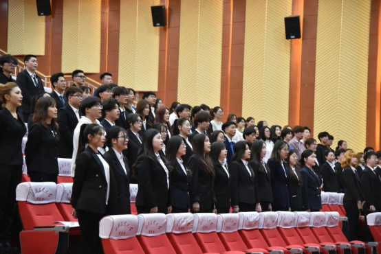 庄严的国歌声响起,全体人员庄严肃穆齐唱国歌。国歌结束,众人就坐。