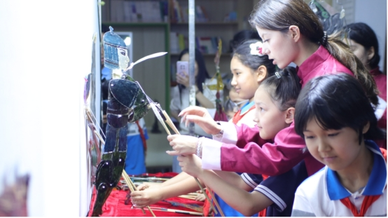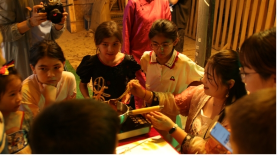 互动的时候,小朋友们挤着往幕后钻,抓着操纵杆摆弄皮影,看那些小人儿“走”起来。团队成员耐心教授孩子们如何做糖画,石板上慢慢浮现出歪歪扭扭的石榴模样——这颗民族团结象征的果子,变成了孩子们接触非遗的鲜活引子。