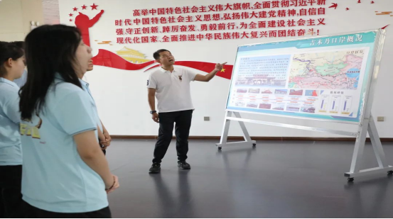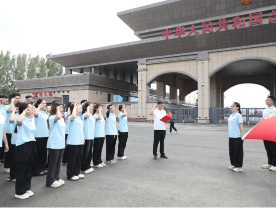 全体师生在吉木乃口岸重温入团誓词,铿锵有力的誓言在国门上空回荡,将爱国情怀与时代责任深深烙印在每一位实践成员的心中。这一刻,吉木乃口岸不仅是地理标识,更成为了鲜活的爱国主义教育课堂和精神坐标。