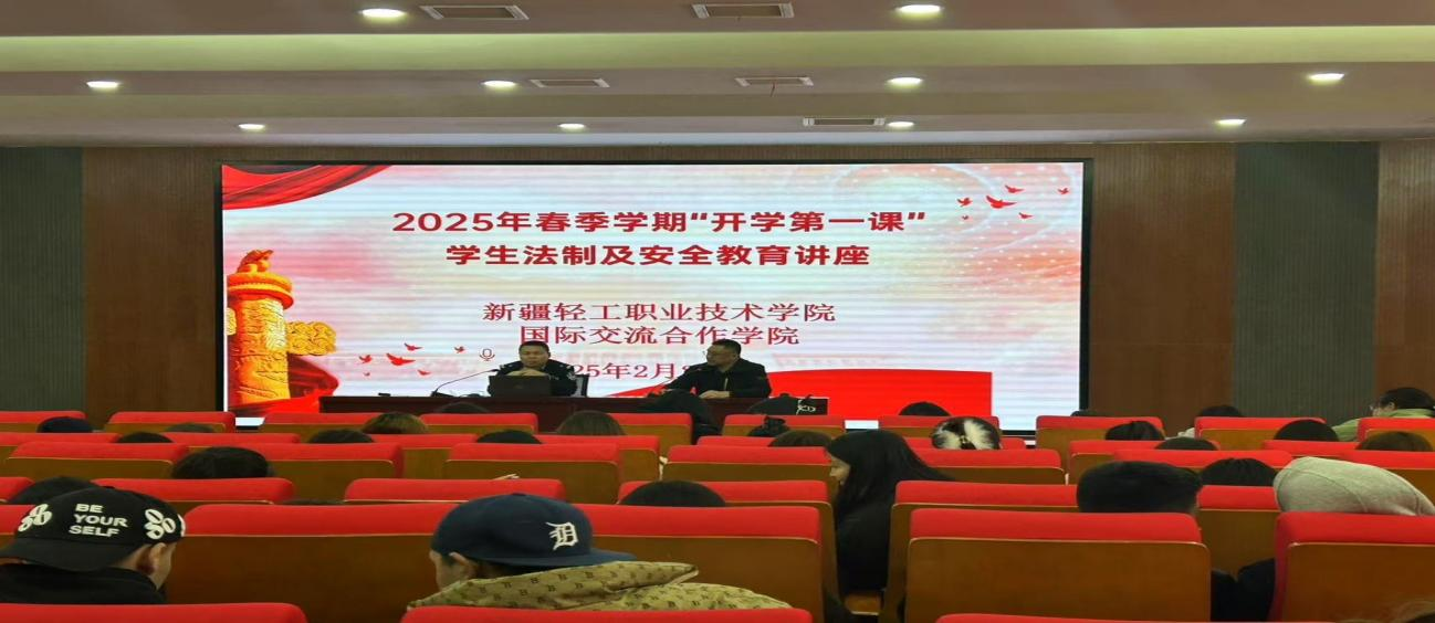 为增强学生的法制观念和安全意识,营造良好的开学氛围,2025 年2月28日,新疆轻工职业技术学院国际交流合作学院在总校区新多功能厅成功举办了《2025 年春季 “开学第一课” 学生法制及安全教育》主题讲座。此次讲座特别邀请到乌鲁木齐市公安局米东公安分局卡子湾派出所民警,学校法制辅导员担任主讲人,学院领导、班主任及全体在校 240 名学生共同参与。