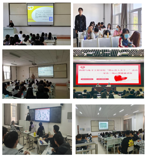 4月,马克思主义学院、商学院、政法学院、教育科学学院、心理学院、地理科学与旅游学院、化学化工学院、生命科学学院、音乐学院、预科学院分别在线上线下通过主题班会、微视频、漫画、微信推文等形式推进心理科普知识宣传。物理与电子工程学院、外国语学院、教育科学学院分别组织了爱情专题讲座;政法学院组织期末考试期间“挫折调试与压力管理”主题讲座;国际文化交流学院、商学院开展自我成长主题讲座。