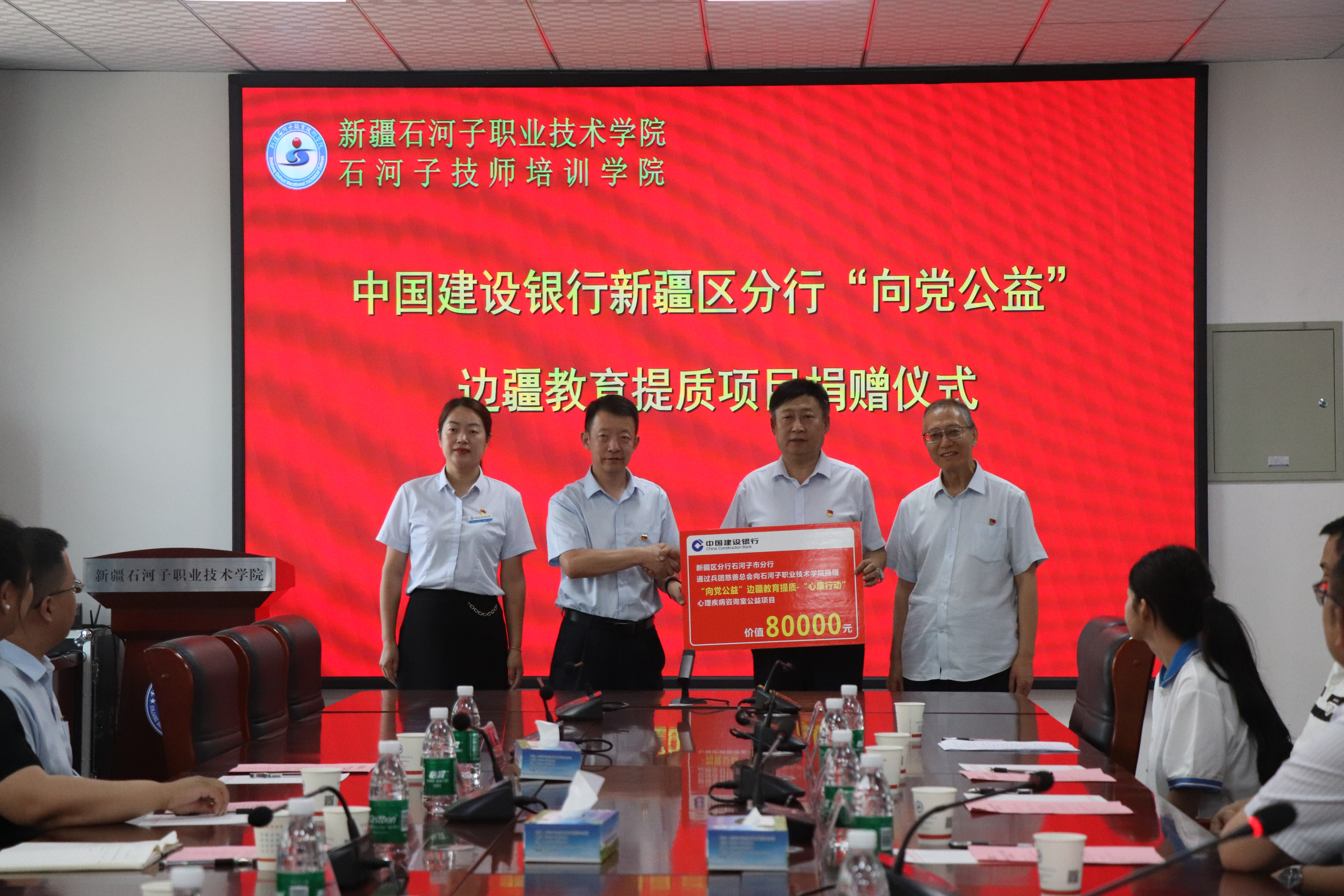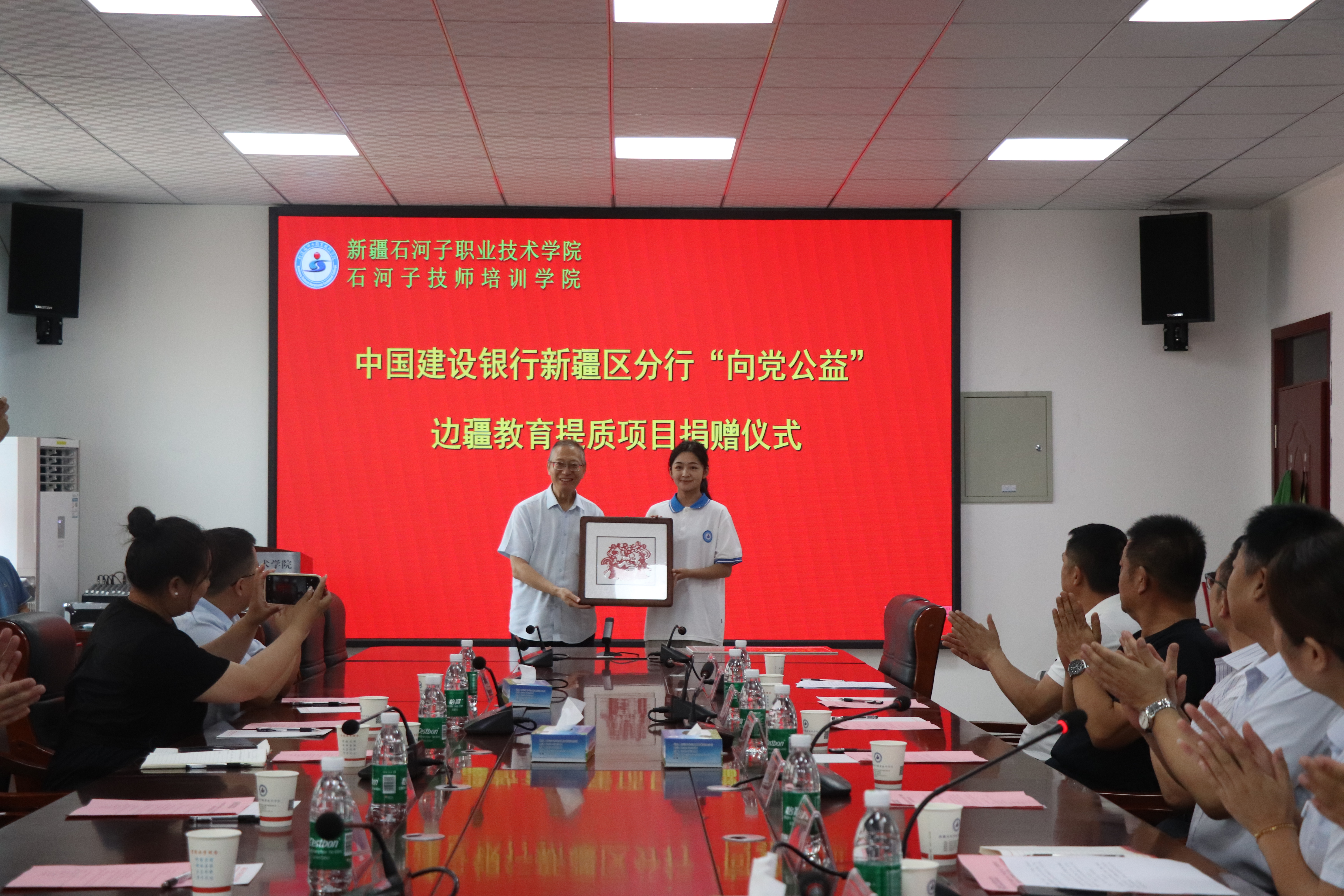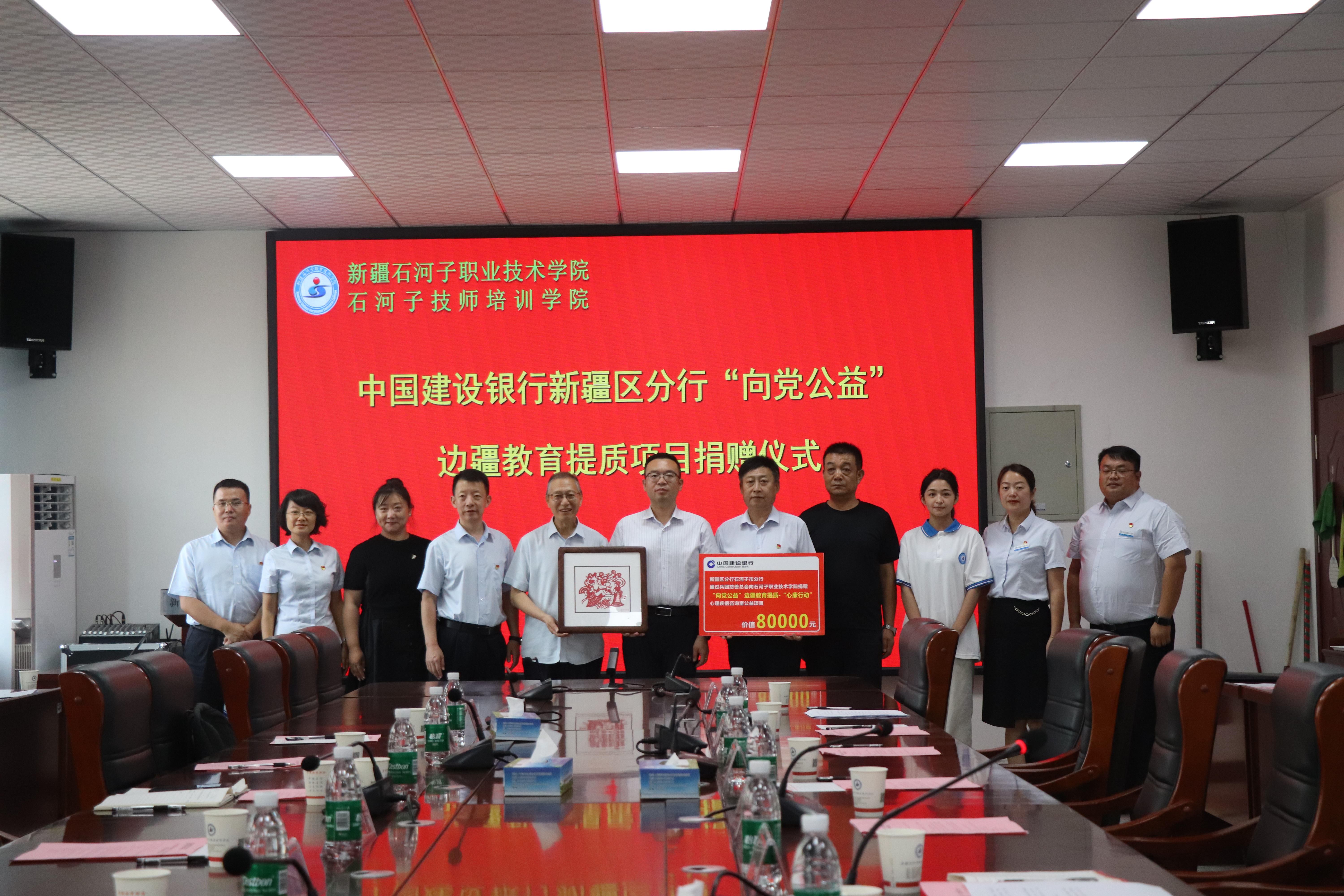 2025年6月26日,中国建设银行新疆区分行“向党公益”边疆教育提质项目捐赠仪式在新疆石河子职业技术学院在厚德楼三楼会议室举行。八师教育局党委书记、局长黄博,兵团慈善总会副秘书长孔令媛,建行新疆区分行公共关系与企业文化部总经理、部长李向党,建行石河子市分行党委书记、行长马翱,学校党委副书记、院长林炯,党委委员、副院长马彩梅等多方领导嘉宾齐聚一堂,共同见证这场爱心助力边疆职业教育的暖心行动。仪式由学校副院长马彩梅主持。