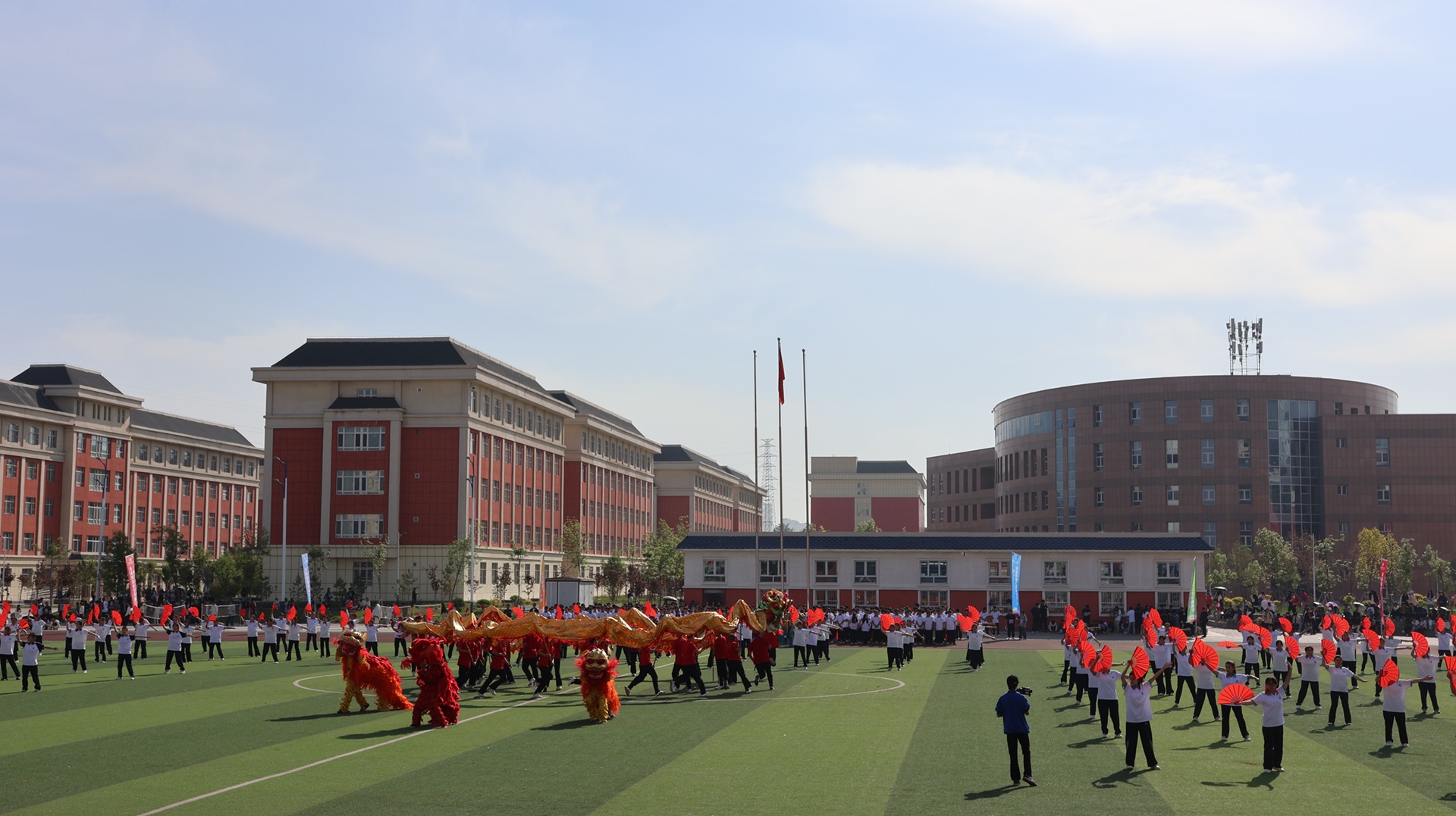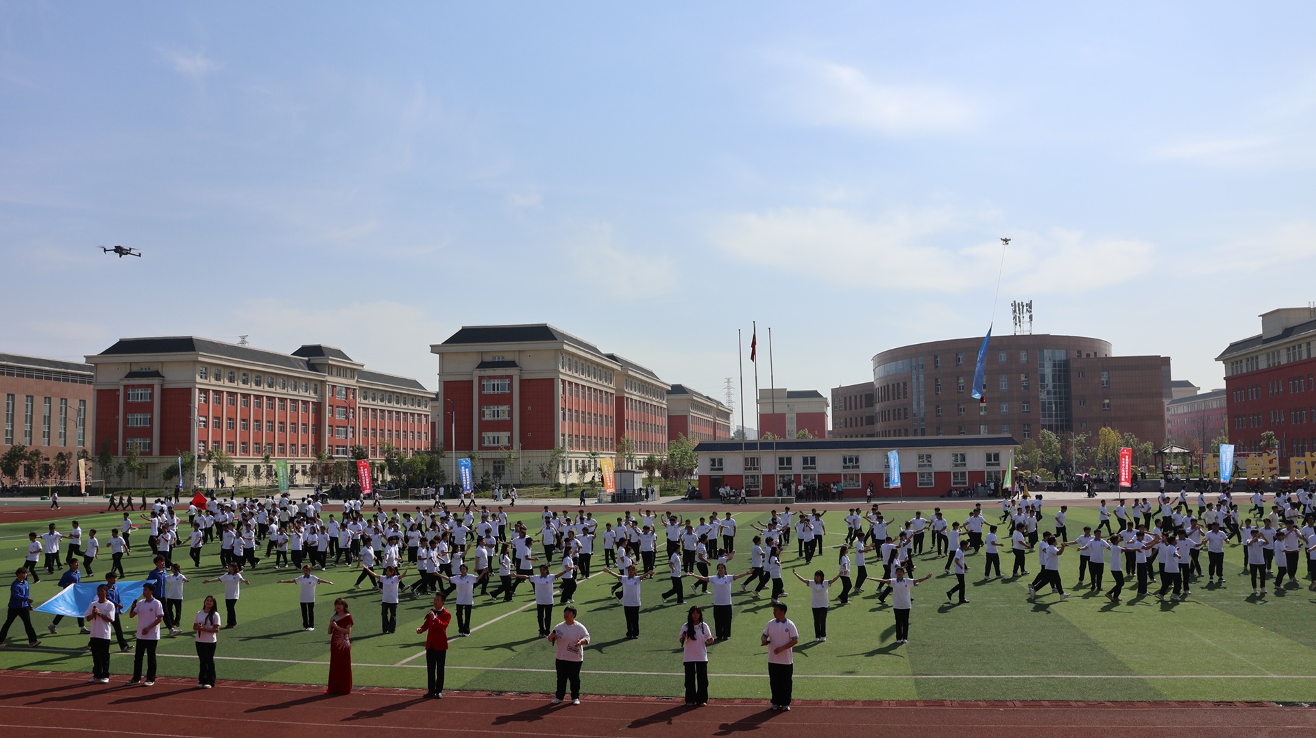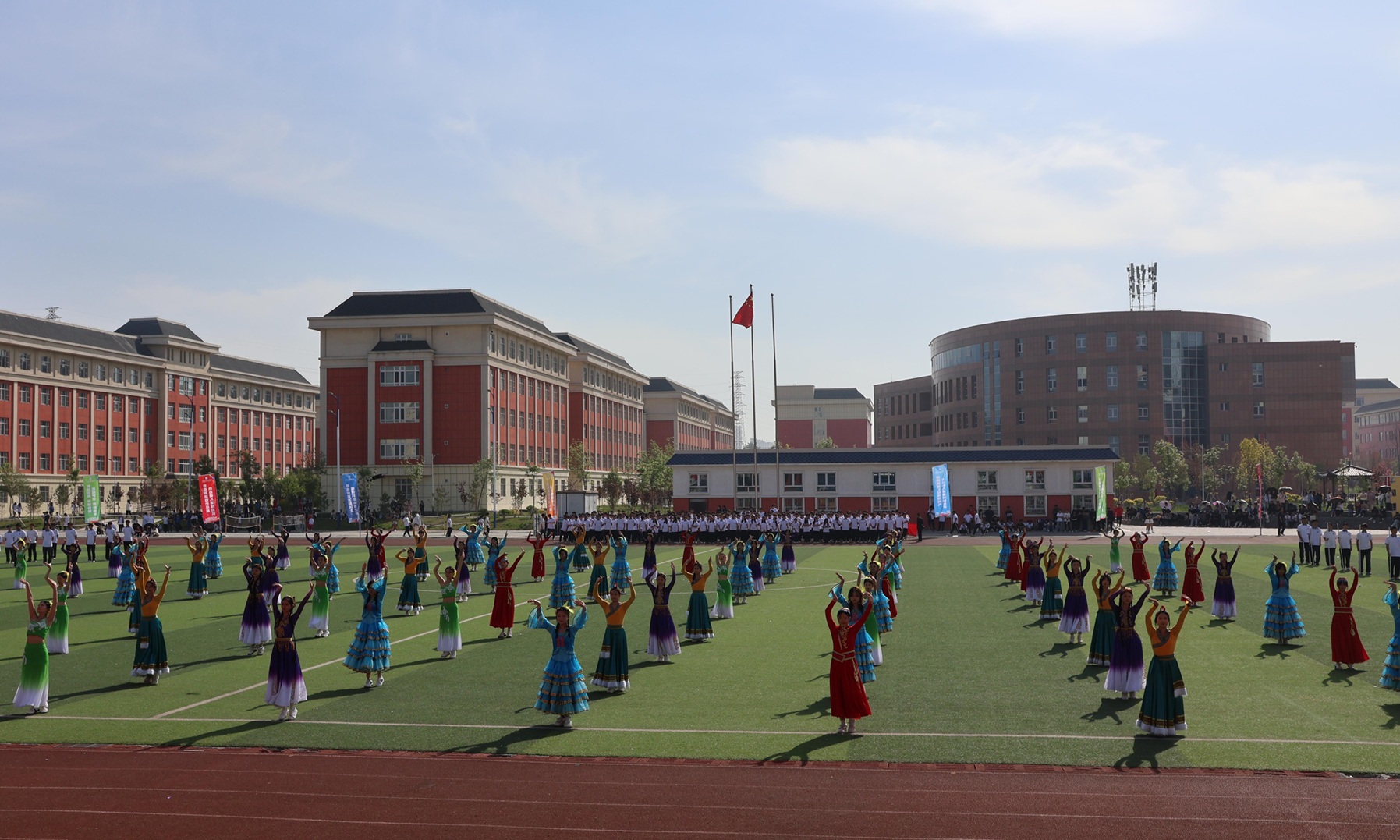 各二级学院联袂呈现了一场精彩绝伦的团体操展演。信息与通信工程学院的舞龙表演《龙狮腾跃 操舞飞扬》震撼开场,为观众带来了一场视觉与艺术的盛宴。现代服务学院《美丽中国》民族舞中,表演者身着民族特色服饰翩然起舞,充分展现传统文化的博大与魅力。数字商贸学院、水利建筑工程学院等四个学院联合编排的武术表演《武韵华章》通过武术招式与舞蹈刚柔并济的结合,彰显中华武术的独特魅力。军士学院《利刃出鞘 决胜沙场》以实战化刺杀操和战术动作表演点燃全场,彰显“携笔从戎、强军报国”的青春担当。机械电气工程学院《少年当燃·智造疆来》演绎了青年学子以科技赋能边疆发展的壮阔图景。