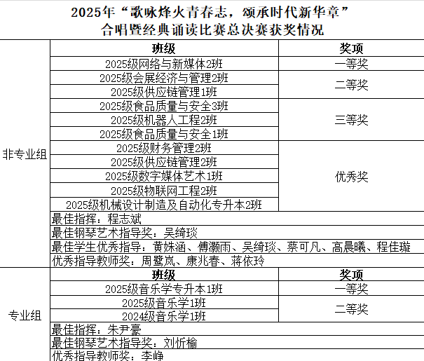 2025年12月9日16:00,由校团委主办,各学院团委,校团委组织部、学生会文艺部承办的“歌咏烽火青春志,颂承时代新华章”合唱暨经典诵读比赛总决赛在俊秀报告厅举行。本次比赛以班级为单位进行汇报表演,经过前期初赛的激烈角逐,非专业组和专业组共15个班级成功入围决赛。