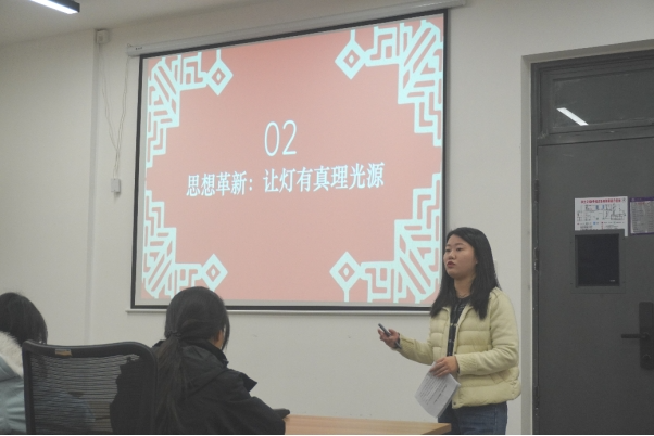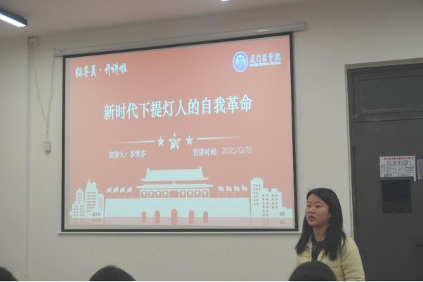 2025年12月15日,护理学院“辅导员·开讲啦——中国共产党人精神谱系宣讲季”活动(第三讲)在我校“一站式”学生社区党团活动室顺利举办。本次宣讲以“新时代下提灯人的自我革命”为主题,由辅导员李雪芬老师主讲,全体青马班学员参加。