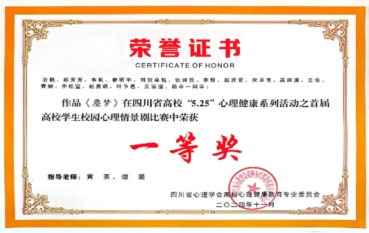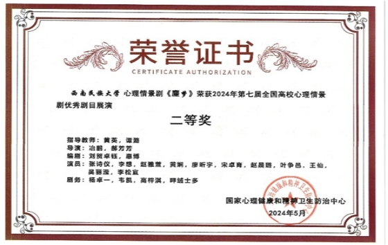 我校原创心理情景剧《塵梦》在2024年四川省首届高校心理情景剧大赛中斩获二等奖,并作为四川省优秀代表作品入围第七届全国高校心理情景剧大赛,最终荣获全国二等奖。