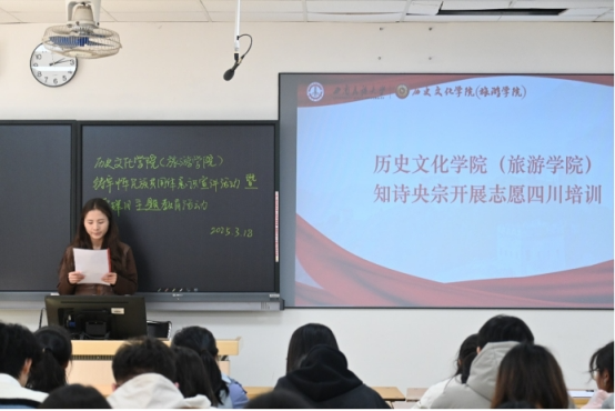 为贯彻落实习近平总书记关于志愿服务的重要论述和对深入开展学雷锋活动作出的重要指示精神,弘扬新时代雷锋精神,不断铸牢中华民族共同体意识,3月19日下午,历史文化学院(旅游学院)在武侯校区举办“铸牢中华民族共同体意识”宣讲活动暨雷锋月主题教育活动,学院学工办副主任兼团委书记蒲菲、学校铸牢中华民族共同体意识青年宣讲团成员代表以及学院各班级学生代表共计80余人参加了本次活动。