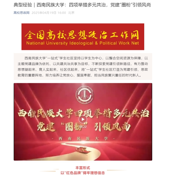 教育部高校思政网宣传报道我校“一站式”学生社区建设工作。根据《教育部思想政治工作司关于开展2025年高校“一站式”学生社区风采展示活动的通知》要求,学生处围绕党建引领、队伍入驻、学生参与、文化建设、数字赋能、条件保障”6个版块启动风采展示工作,并分类开展总结宣传工作。4月18日,围绕党建引领版块的总结《西南民族大学四项举措多元共治,党建“圈粉”引领风尚》及视频,被教育部高校思政网宣传报道。