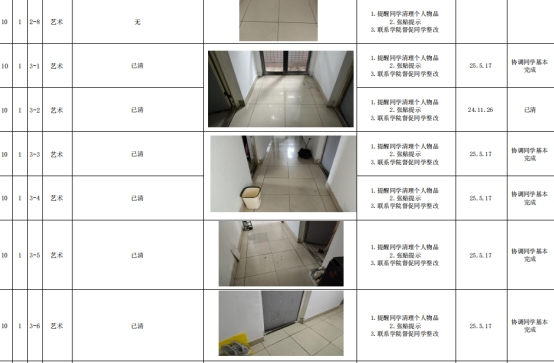 学生社区管理员队伍联合各学院(书院)、社区辅导员、驻楼辅导员、楼管会等,就楼道物品清理进行温馨提示,及时进行沟通劝导、建立完善清理台账,共同开展消防通道清理整治,及时反馈跟进,并计划利用学生社区合适的空间开展行李寄存工作。
