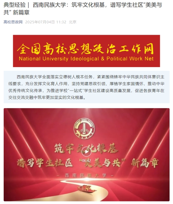 西南民族大学"一站式"学生社区建设成果《筑牢文化根基,谱写学生社区"美美与共"新篇章》获教育部高校思政网专题报道。该报道以"党建引领、队伍入驻、学生参与、文化建设、数字赋能、条件保障"六大板块为核心内容,系统总结了学校在学生社区建设方面的创新实践与显著成效。报道发布后,在师生群体中引发热烈反响,获得广泛好评。此次专题报道不仅彰显了学校思政工作的创新成果,更标志着我校在新时代学生社区建设方面取得了阶段性重要突破,为深化"三全育人"综合改革提供了成功范例。