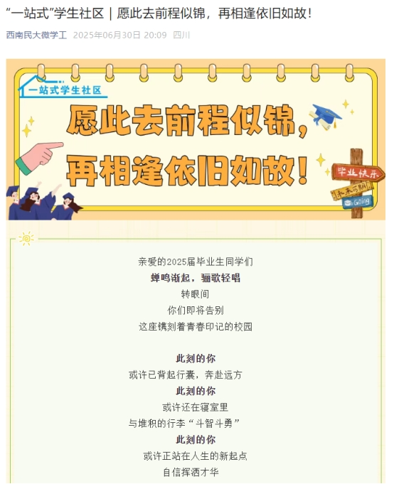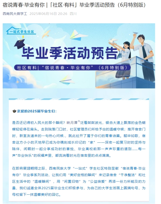 西南民族大学"一站式"学生社区温情送别2025届毕业生。为营造温馨有序的毕业氛围,让学子们带着美好回忆离开校园,西南民族大学"一站式"学生社区精心策划了毕业季系列活动。通过发布暖心祝福视频、组织特色送别活动等形式,社区管理老师们用真挚的情谊为毕业生送上最温暖的祝福,展现了学生社区服务队伍积极向上的精神风貌。这些充满温情的举措,不仅让毕业生感受到"家"的温暖,更见证了四年来师生间建立的深厚情谊,为2025届学子的大学时光画上圆满的句号。