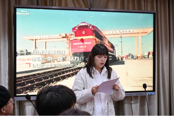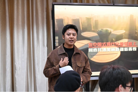 在交流环节,三位学子结合自身经历与专业思考,分享了对民族团结与新疆发展的深刻感悟。昂萨尔·加合提同学以个人的“双城生活”为引,生动描绘了新疆因“连接”而缩短距离、因“活力”而蓬勃发展的现代图景。玉山江·艾里江同学结合自身参与“韦莱小课堂”推动国家通用语言的实践经历,分享了新时代青年在“文化润疆”中的责任与担当,展现了新疆故事的多样性与感染力。赵婷同学结合其思政专业背景,从理论高度剖析了新疆巨变背后党的民族政策的成功实践与思政教育的育人作用,阐释了铸牢中华民族共同体意识的时代价值。
