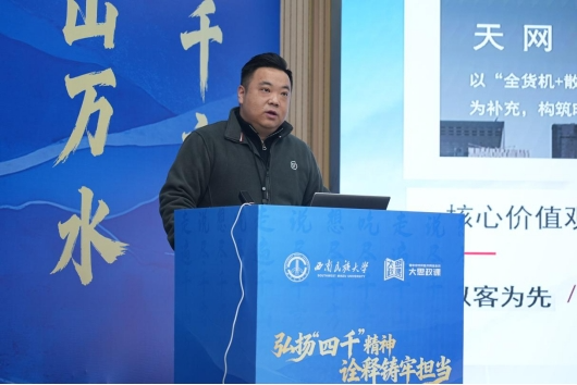 在第一篇章中,四川顺丰党委副书记、副总经理,四川省先进工作者、成都市五一劳动奖章获得者贾凯以《物流智变·人才育新:数智物流时代个人发展与行业变革》为题,介绍了顺丰集团“天网、地网、信息网”三网融合的创新实践及城市低空无人化物流网络规划,并通过分享顺丰行业发展与个人发展相结合的成长心得,勉励青年学子要保持谦卑的心态和持续学习的热情,充分发挥好专业能力,并敢于打破专业壁垒,努力把别人的本事变成自己的本领,去创造人生无限可能。