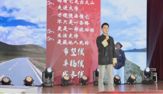 郭建勋老师以“人生路、变革路、团结路”诠释“两路”精神,重温那段攻坚克难的历史岁月,并以西南民大优秀校友的成长故事,展现川藏公路为雪域高原带来的沧桑巨变。藏区大学生达娃罗布“这条路是藏地人民的希望线、幸福线、成长线”的述说,让“两路”精神可知可感。孙红林老师动情讲述祖辈修路的悲壮往事,一句“不悔”承载着深沉敬意,也促成他执导纪录片《千山》,致敬川藏交通建设者。“知所从来,方明所往”,传承“两路”精神,正是为了坚定走好新时代的复兴之路。篇章末尾,《川藏路》歌声悠扬,激荡起青年学子继往开来、奋勇前行的豪情。