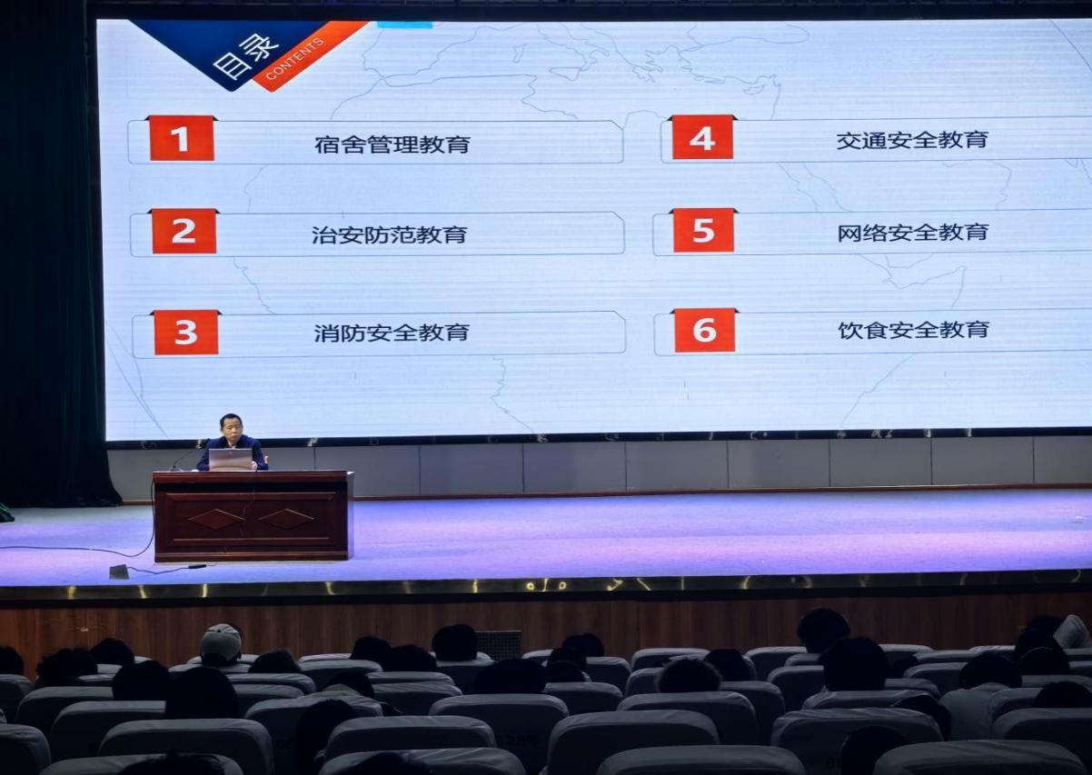 吴勇从学生社区宿舍管理、治安防范、消防安全、交通安全、网络安全、饮食安全六个方面展开讲授:从“宿舍管理教育”规范用电、卫生等生活细节,到“治安防范教育”剖析校园盗窃、诈骗案例;从“消防安全教育”传授火灾应急技巧,到“交通安全教育”“网络安全教育”“饮食安全教育”等实用技能,通过理论结合实例的讲解,将安全知识深入浅出地传递给学生。