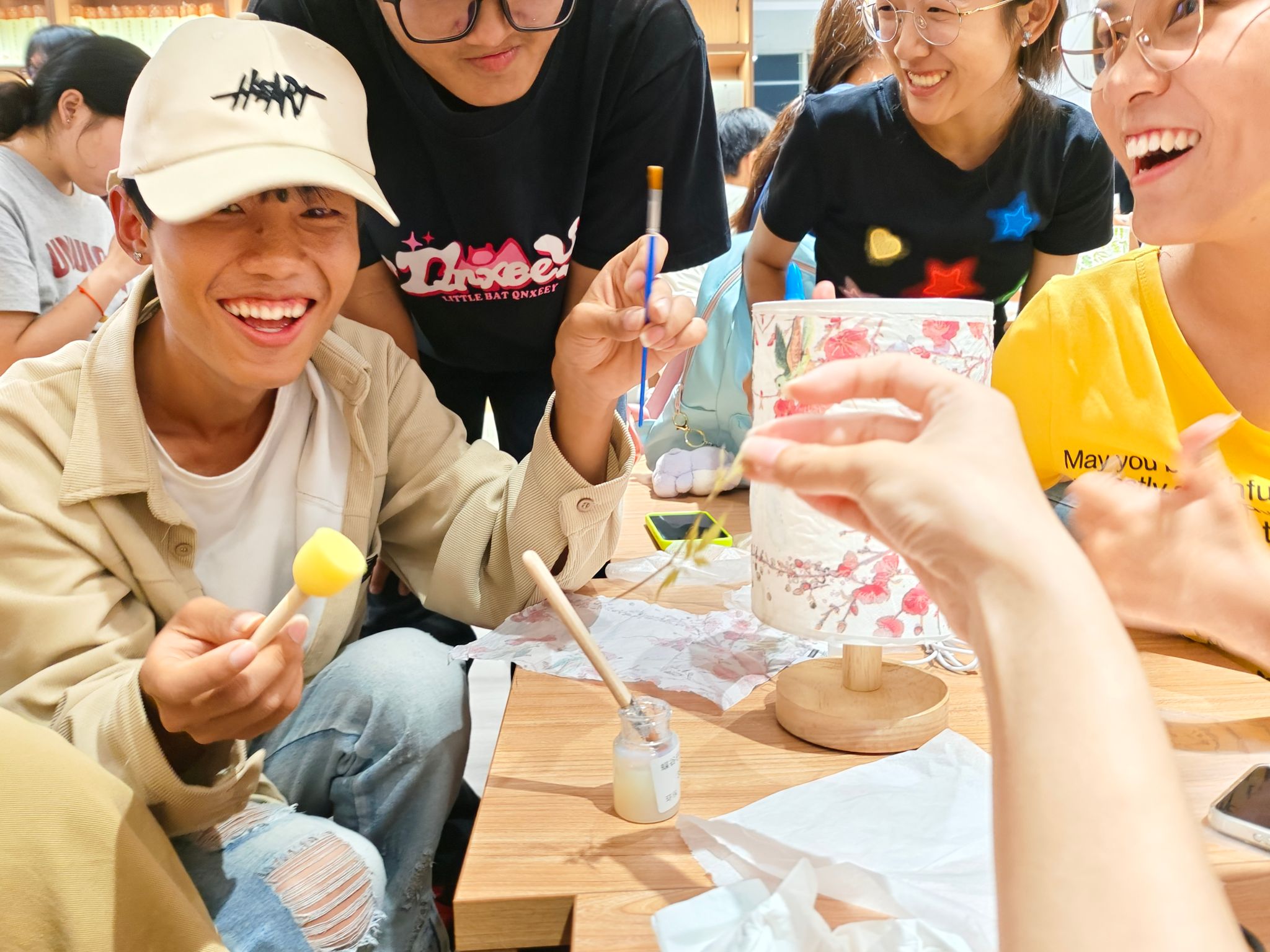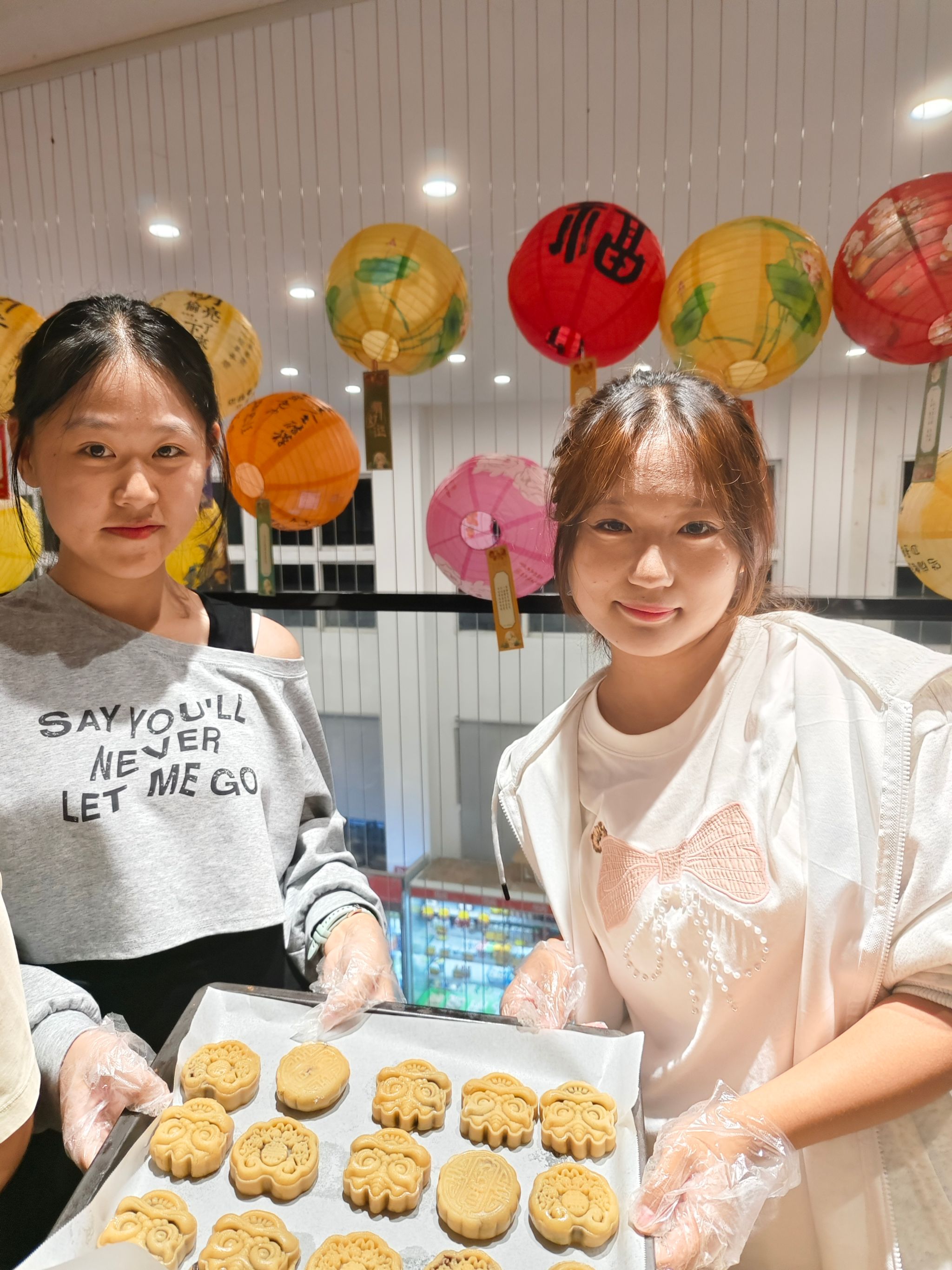 月饼制作环节,师生协作,揉面、包馅、压模,印有传统图案的月饼渐次成型。烘焙间隙,创意花灯制作同步展开,干花点缀、彩笔描绘,美好期许融入手工。