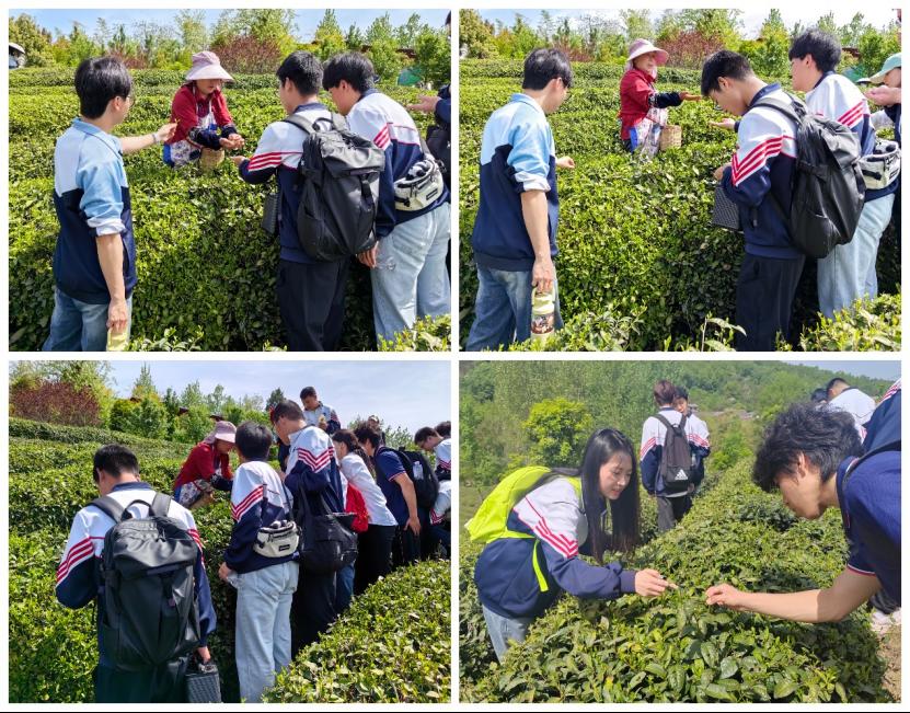在初步掌握采茶要领后,热情的茶农们加入了进来,与学生们展开了一场欢快的采茶互动。茶农们手把手地教学生们如何辨别茶叶的优劣,如何在茶树间穿梭自如,还分享了许多他们多年积累的采茶经验。“指尖发力要轻柔,眼到手到心更要到!”茶农手把手纠正同学们的采茶姿势,从指尖翻飞间既要追求效率,到严守“不伤老叶、不留茶蒂”的环保铁律,工匠精神融入每个细节。在这场行走的生态思政中,让同学们感悟到了采茶误差控制在0.1克内的严苛标准,就像新能源汽车电池组装需要分毫精度,采茶也需工匠级的专注,造车要如制茶,既要有智能化的“新”,更要有守住工匠精神的“芯”。