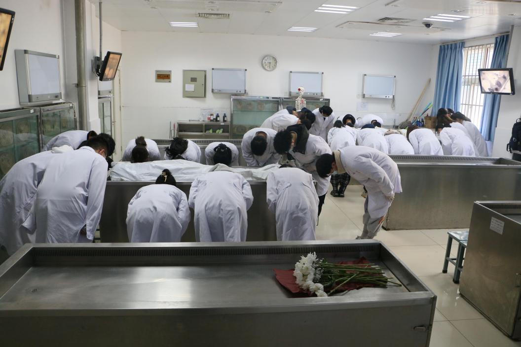学校以身边榜样的事迹融入实践课堂,讲述“以身试药”的王延涛教授,生前是全国第一届科学大会获奖者,去世后成为“大体老师”再上讲台;“中国好人”“全国劳动模范”方敬同志,几十年如一日倾尽积蓄资助家乡学子等“大体老师”生前的感人事迹,深入挖掘专业教育中“大体老师”这一特殊教育资源所具有的特殊专业思政元素,让敬畏与珍视生命的种子在心中扎根。学校在局部解剖学课程开课前举办“大体老师启用及感恩仪式”的传统已经坚持了多年。让学生在与“大体老师”的第一次亲密接触中,在医学专业教育的一开始就打下敬畏生命、感恩奉献、恪尽职守的责任感和使命感,从而点亮珍爱生命、大医精诚、救死扶伤的医学初心,树立献身生命科学和医学事业的远大志向。