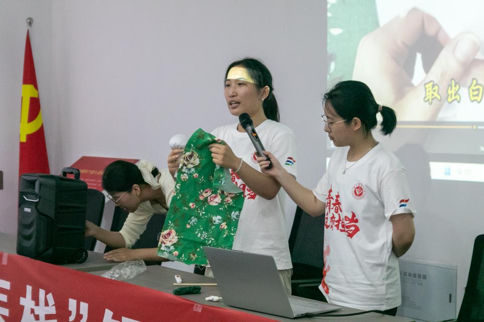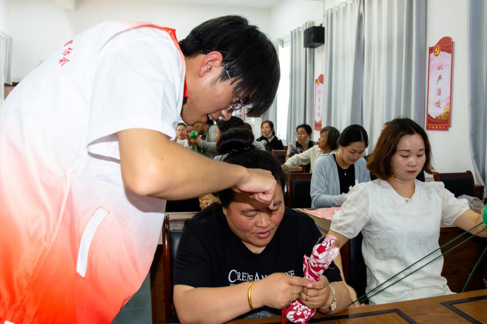 实践团将传统文化与养生知识紧密结合,艾草捶制作+“拍八虚”等养生操赢得了老人们的青睐。从整理药物到封口捆绳,操作互动间既帮助群众了解了传统养生文化,也传递了手工制作的乐趣。用亲手制作的艾草捶轻拍肩颈穴位,不少人连连称赞“自己做的养生锤,用着踏实又暖心!”