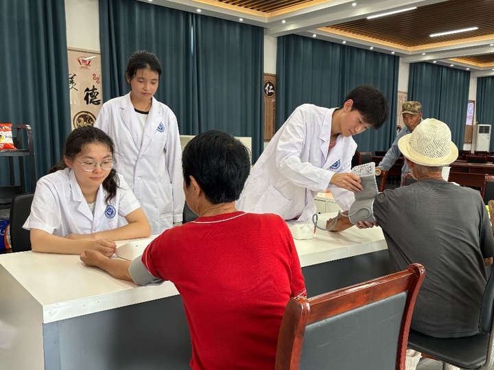 “老人家,您的血压要注意控制啊”“夏季防中暑,您要多补充水分”一句句温暖的问候、一声声细致的叮嘱,为老人带来贴心的健康关怀。白衣少年们将厚重的专业书籍化作田间地头的家常话,把复杂的病理知识变成生动形象的比喻,为老人科普夏季高发疾病防治知识,并提供健康义诊与咨询服务。测量血压时专注的眼神、解答疑问时耐心的神态、记录病情时严谨的态度……每一处细节都在诉说着医者的仁心。