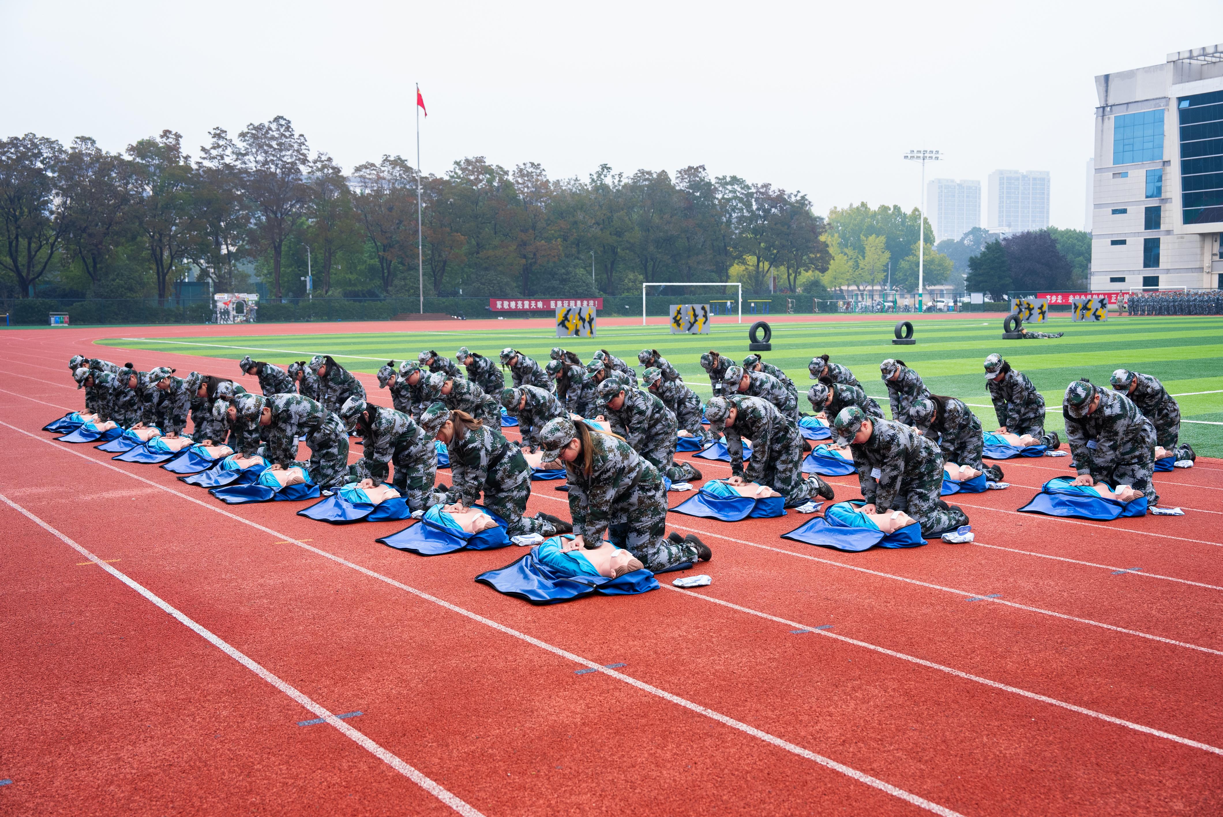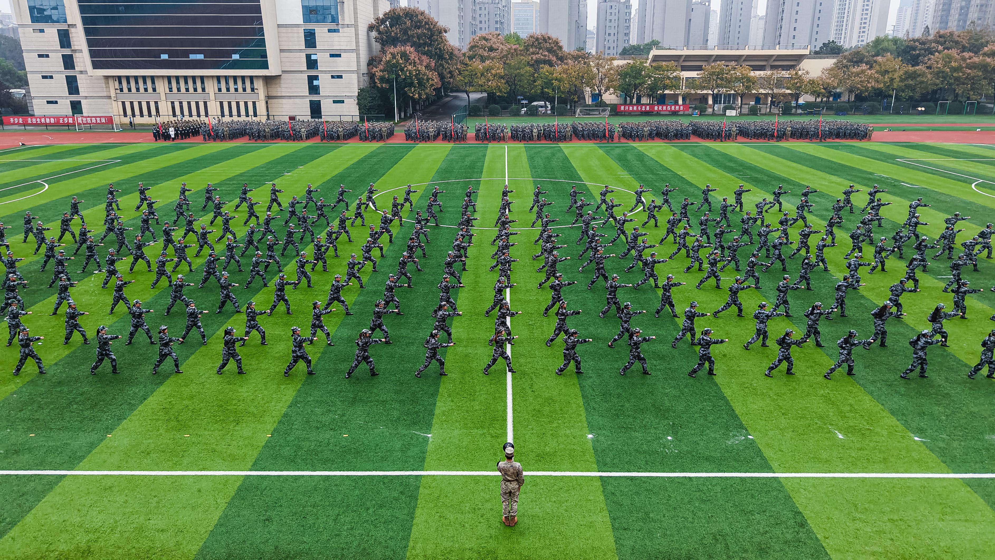 伴随着铿锵有力的分列式进行曲,12个学生方阵步伐整齐、口号响亮,依次走过主席台,展现出饱满的青春风采。随后,军体拳、战地救护、红蓝对抗、擒拿格斗、防暴棍术、战术演练等七个表演项目轮番上演,动作精准、气势如虹,赢得了现场阵阵掌声。通过为期两周的军事训练,2800余名新生磨炼了意志,锻炼了体魄,展现出徐医学子良好的精神风貌。