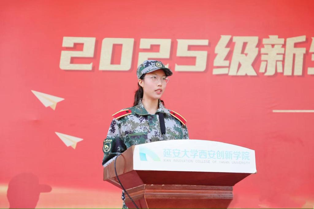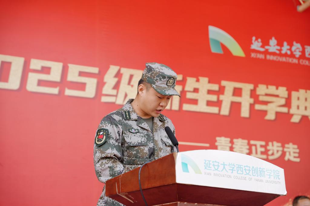 新生代表、文学与文化传播学院汉语2506班崔译丹在发言中倡议同学们践行校训精神,在军训中磨砺意志,在学业中求真创新,将个人成长融入学校与服务社会的发展之中,不负时代、不负韶华。随后,她带领全体参训学生进行了庄严的宣誓。