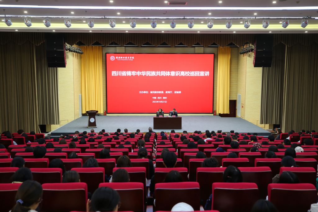 为进一步铸牢中华民族共同体意识教育,促进各族师生交往交流交融。10月21日下午,“四川省铸牢中华民族共同体意识高校巡回宣讲活动”在学校经开区聚雅厅举行。本次活动特邀四川省铸牢中华民族共同体意识高校巡回讲堂三年行动宣讲团成员、中共雅安市委党校副校长、四川长征干部学院雅安夹金山分院副院长杨建学担任主讲嘉宾。学校党委常委、宣传统战部部长、工会主席夏安琼出席并致辞,各二级学院党组织书记、相关职能部门负责人、思政课教师、辅导员及学生代表共计300余人参加宣讲会。