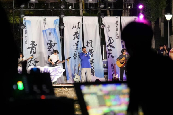 夜幕降临,毕业市集摇身变为活力四射的音乐现场。云中学子联袂登台,奏响青春乐章。学生以传统民乐融合现代节奏,演绎《兰亭集序》等民乐曲目,将中医药文化融入律动之中,同时歌手带来婉转民谣与激情摇滚,用歌声诉说毕业情思。舞台灯光与挥舞的荧光棒交相辉映,台上台下齐声合唱,将毕业季的热烈氛围推向高潮。