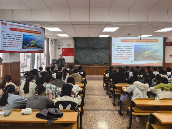 丁中涛以“十五五”规划建议的内容导入课程,从教育、科技、人才三者的辩证关系和一体推进的内涵切入,深刻分析一体推进教育科技人才发展的重要战略意义和战略部署。丁中涛将个人学习的心得体会与一个个鲜活生动的案例相结合,引发学生思考。他还介绍了学校“十四五”建设成效与“十五五”规划设想,使学生对学校未来发展更加充满信心。