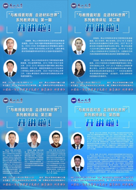 为贯彻落实《教育部关于加快建设高水平本科教育全面提高人才培养能力的意见》,促进基础学科建设和学院、专业长足发展,为师生搭建沟通桥梁,对标《高校“一站式”学生社区综合管理模式建设工作指南》,推动学生社区育人模式常态化,促进学风建设,搭建师生交流平台,2023-2024学年燕山大学“寓见榜样”一站式学生社区工作站举办多期以全院教师为单位、以学生为主体的“与教授面对面 走进材料世界”系列教师讲坛。讲坛由学院“一站式”学生社区服务工作站负责人、辅导员董亮老师主持。