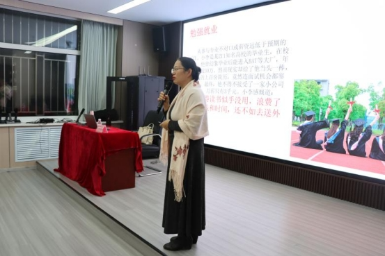 钟多娣校友从当前的就业形势、就业困局、人才需求等几个方面进行介绍,鼓励同学们要努力培养独立思考、终身学习的能力,还要不断调整心态、端正态度,树立正确的职业观和价值观,积极做好职业规划。