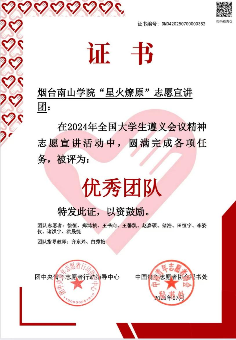 为引导青年学生弘扬遵义会议精神,赓续红色血脉,团中央青年志愿者行动指导中心、中共遵义市委、共青团贵州省委联合开展了2024年全国大学生遵义会议精神志愿宣讲活动。烟台南山学院智能科学与工程学院“星火燎原”志愿宣讲团在志愿宣讲活动中凭借出色表现,荣获“优秀团队”称号。此次活动旨在纪念遵义会议90周年,传承和弘扬遵义会议精神。