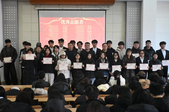 大会在庄严的国歌声中开幕。年度工作回顾短片重现了志愿者服务一线的精彩时刻,呈现出本年度志愿服务的丰硕成果。随后,在表彰环节,学院团总支书记、学工干事邢水英宣读了“优秀志愿服务团队”“优秀志愿者”及其他奖项的获奖名单。学院党委副书记、副院长吕连鹏为获奖集体和个人颁发荣誉证书并合影留念。