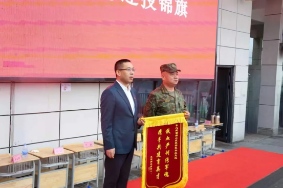 党委书记李梦醒为赫山区武装部民兵应急连庄重授旗,感谢他们军训期间的坚守付出,更激励队伍以旗为向勇担使命。